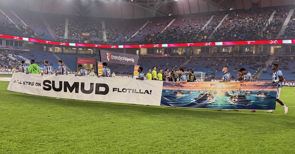 Bordo-mavili taraftarlar, kale arkasına “Gazze’de hayat var, vicdanlarda sızı” ve “Sumudumuz Gazze’ye” yazılı pankartlar astı. Trabzonsporlu futbolcular da sahaya “All Eyes Sumud Flotilla (Tüm Gözler Sumud Filosu’nda) ” yazılı pankart ile sahaya çıktı.